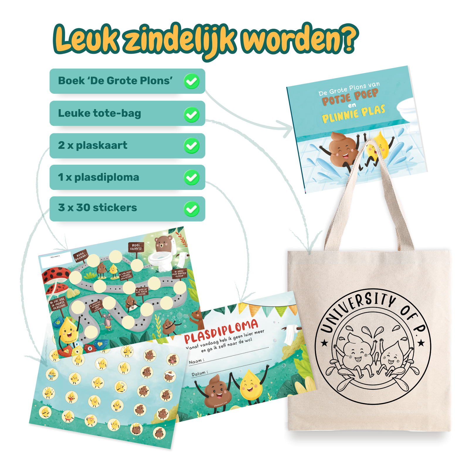 Zonder gedoe beginnen over de grote wc? Start dan met het boekje met stickers. Meteen aan de slag? Kies de beloningsset. Gaan jullie er voor? Kies de Plastas! Met plezier samen lezen, plakken én plassen.